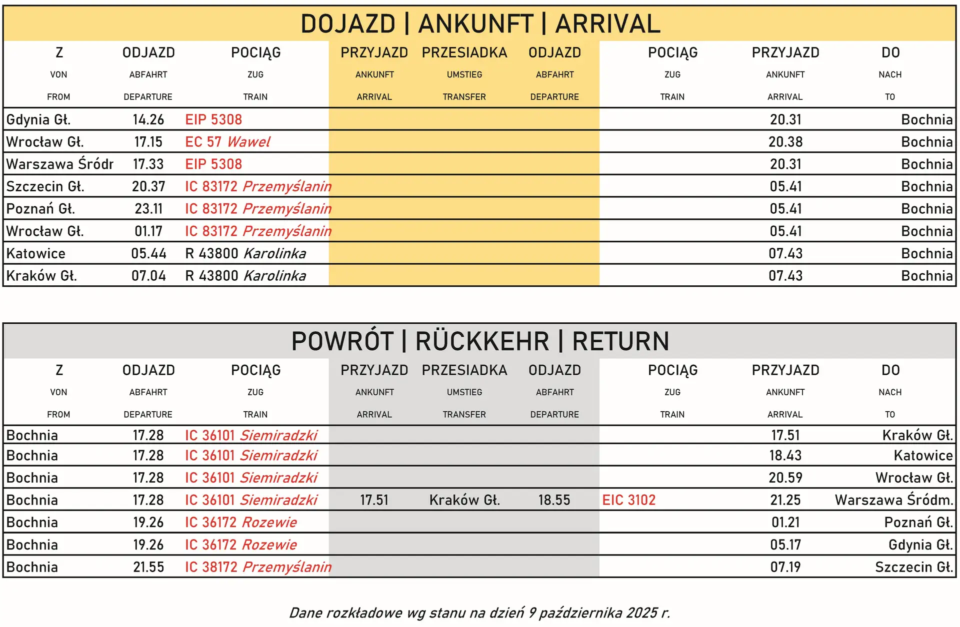 - The nearest train station is BOCHNIA, from where it is easy to reach the meeting point.