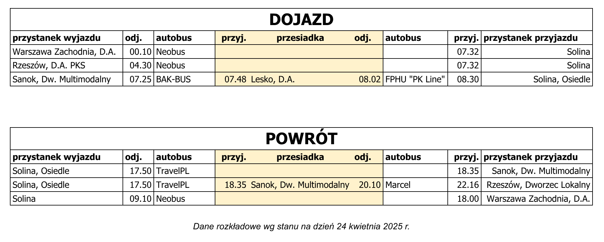 Wiemy, że Solina poza sezonem to prawdziwe wyzwanie komunikacyjne. Niestety, autobusów jest jak na lekarstwo, a dogodne połączenia można policzyć na palcach jednej ręki. Zrobiliśmy jednak wszystko, co w naszej mocy, żeby znaleźć dla Was jakiekolwiek sensowne opcje dojazdu i powrotu – naprawdę daliśmy z siebie 100%.